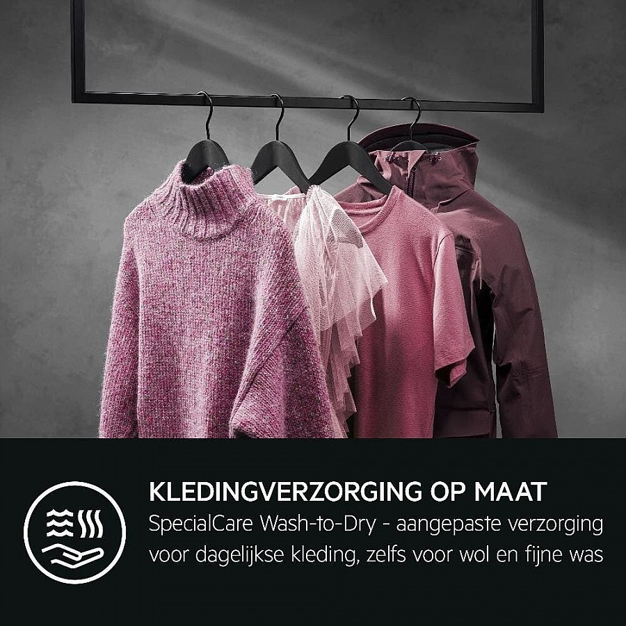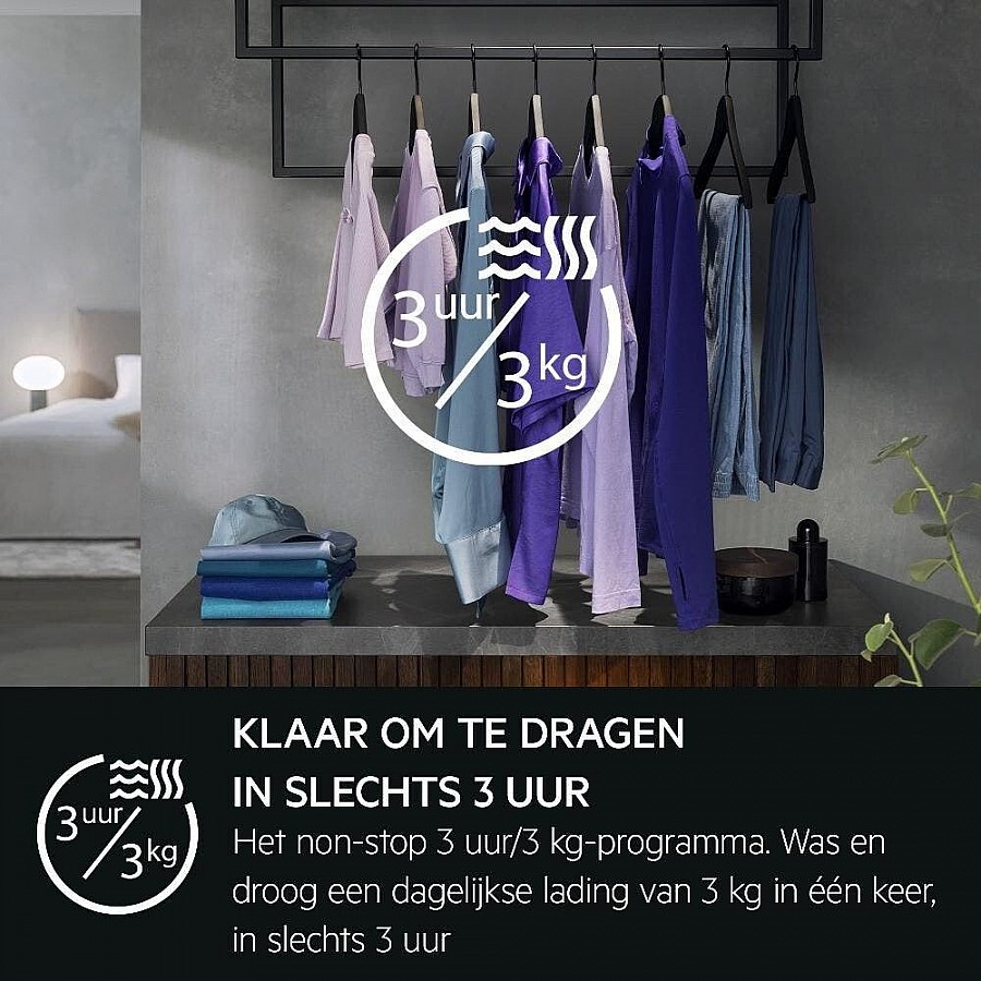 Het SpecialCare Wash-to-Dry systeem maakt gebruik van aangepaste trommelbewegingen en temperatuurcontroles die specifiek zijn afgestemd op de gevoelige structuur van wol en tere weefsels, een proces dat is gecertificeerd door Woolmark Blue. Dit garandeert een volledige, veilige reiniging en droging zonder risico op beschadiging. Combineer dit met het NonStop 3u/3kg-programma, dat een geoptimaliseerde sequentie van wassen en drogen uitvoert, en u heeft een krachtige combinatie voor spoedklussen. Binnen drie uur is een lading van 3 kg volledig gereed, waardoor u geen tijd verliest en altijd een reserve-outfit paraat heeft.