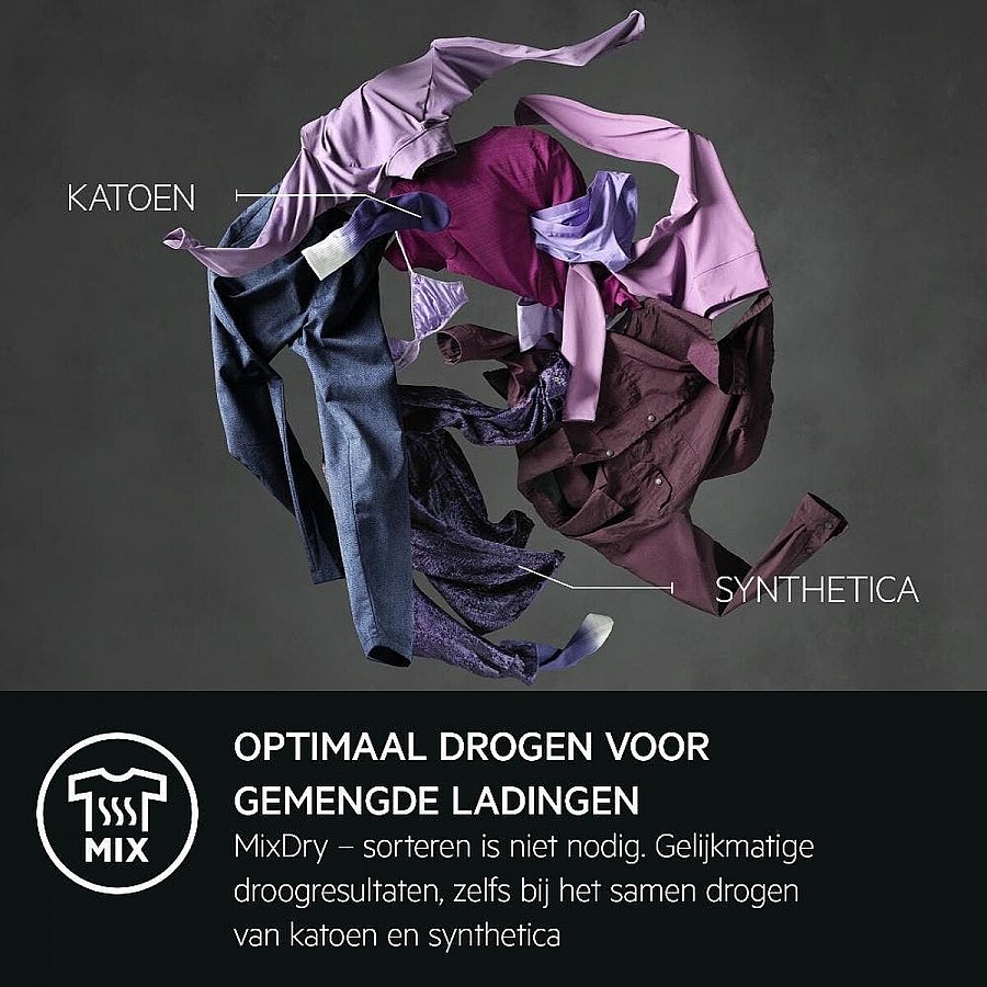 Het MixDry-programma elimineert de noodzaak om uw was te sorteren door katoenen en synthetische stoffen intelligent samen te drogen zonder over- of onderdrogen. Dit wordt ondersteund door de PreciseDry vochtigheidssensoren, die real-time metingen verrichten en de droogcyclus en het energieverbruik proportioneel aanpassen aan de grootte en het vochtgehalte van de lading. Het resultaat is een perfect gedroogde was waarbij elke lading de exact benodigde zorg krijgt, wat tijd en energie bespaart en uw kleding altijd in topconditie houdt.