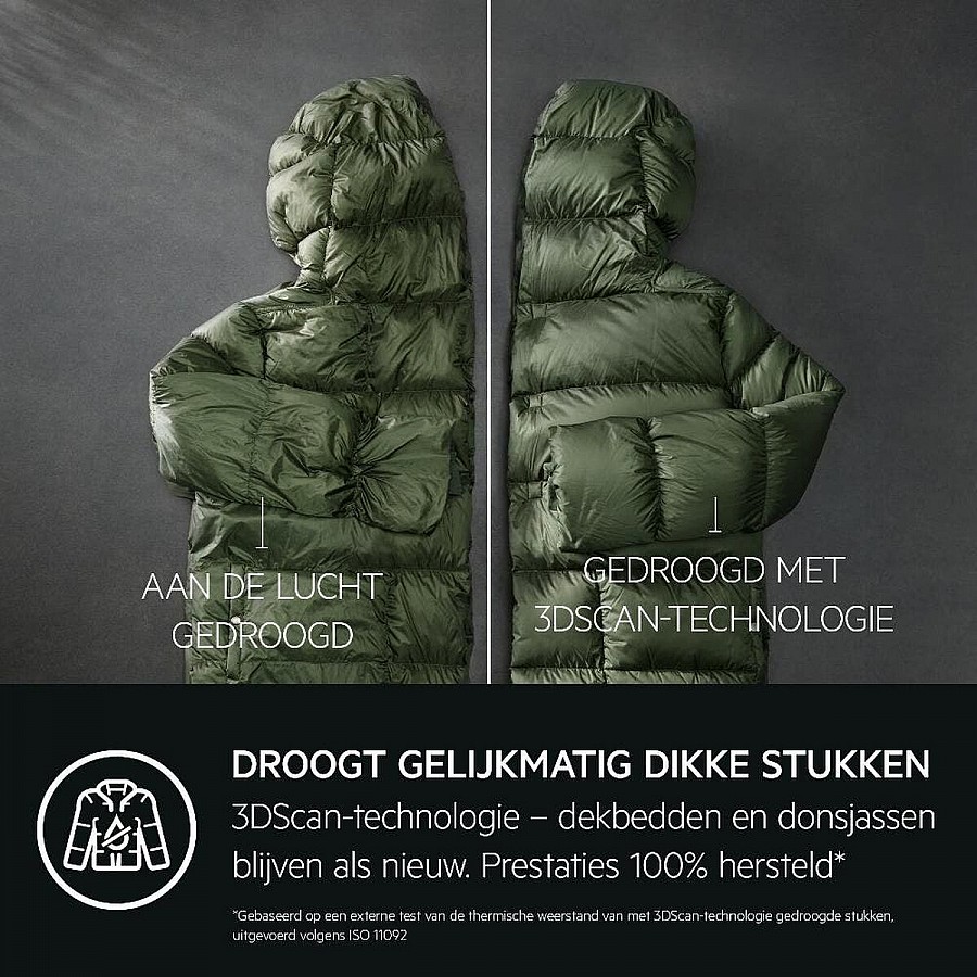 De geavanceerde 3DScan-technologie gebruikt sensoren die tot vijf centimeter diep in uw wasgoed kunnen scannen om de exacte vochtigheidsgraad te meten. Dit garandeert een uiterst nauwkeurige droging waarbij elk kledingstuk, van een dun katoenen shirt tot een dik winterdekbed, perfect en gelijkmatig droog wordt. Gecombineerd met de SensiDry technologie wordt uw wasgoed op de helft van de gebruikelijke temperatuur gedroogd, wat zorgt voor optimale zorg voor uw textiel.