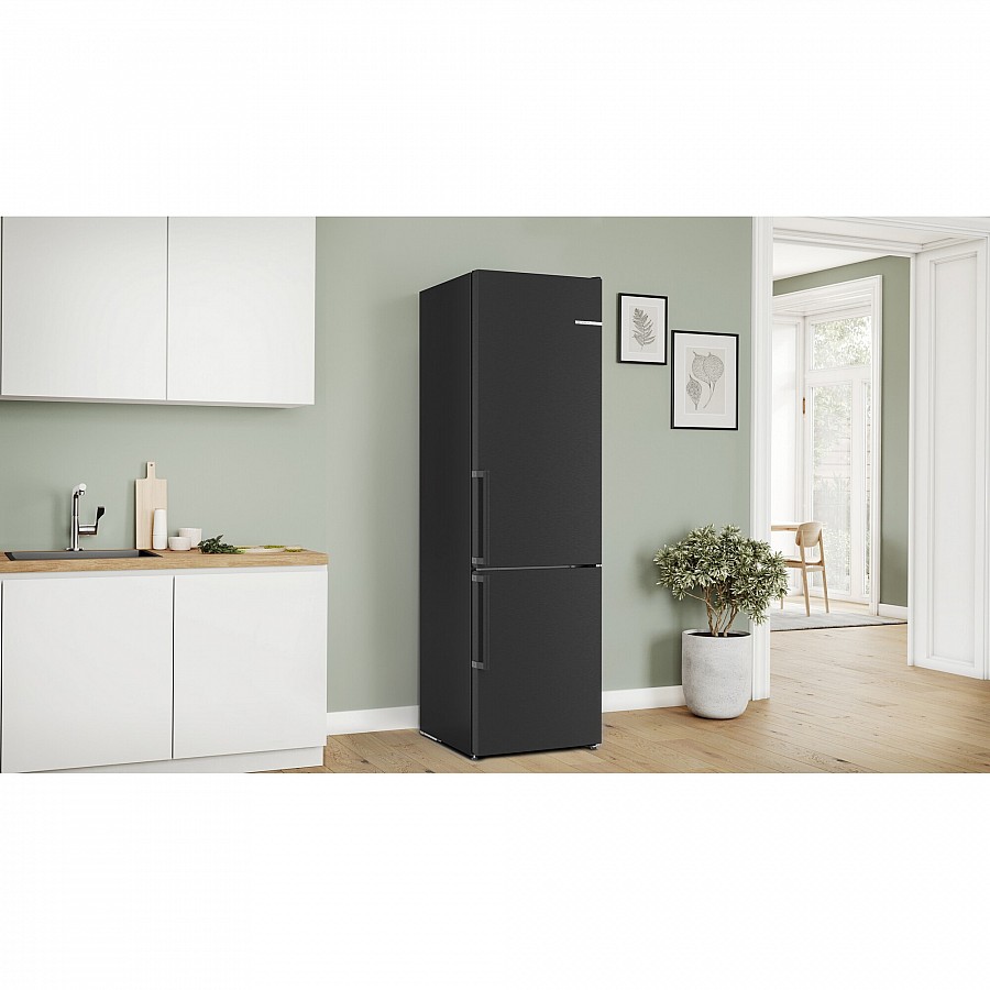Deze Bosch KGN39VXAT vrijstaande koel-vriescombinatie biedt het gemak van Total No Frost, een hoogwaardig VitaFresh bewaarsysteem voor een langere versheid van je etenswaren, een energiezuinige A-klasse prestatie, een perfecte pasvorm voor elke keuken en een stijlvol geborsteld zwart staal design dat vingerafdrukken maskeert voor een altijd verzorgde uitstraling.