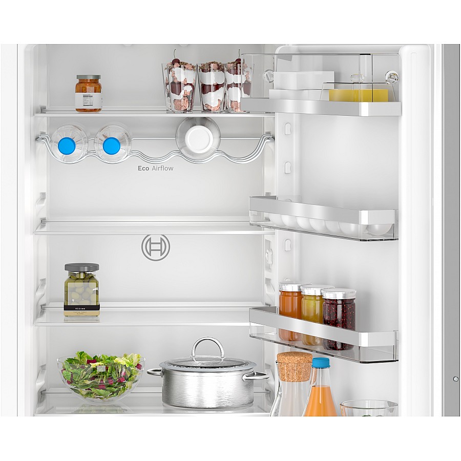 Dankzij de No Frost technologie circuleert er continu gekoelde, droge lucht door zowel het vries- als het koelgedeelte van de Bosch KIN96ADC0. Dit geavanceerde ventilatiesysteem, Eco Airflow genaamd, voorkomt actief de vorming van ijsaanslag op de wanden en in het vriesvak. Het grote gebruiksvoordeel is dat u nooit meer moeite hoeft te doen met handmatig ontdooien, terwijl een constant en gelijkmatig temperatuurniveau in het hele apparaat de kwaliteit van alle opgeslagen producten garandeert.