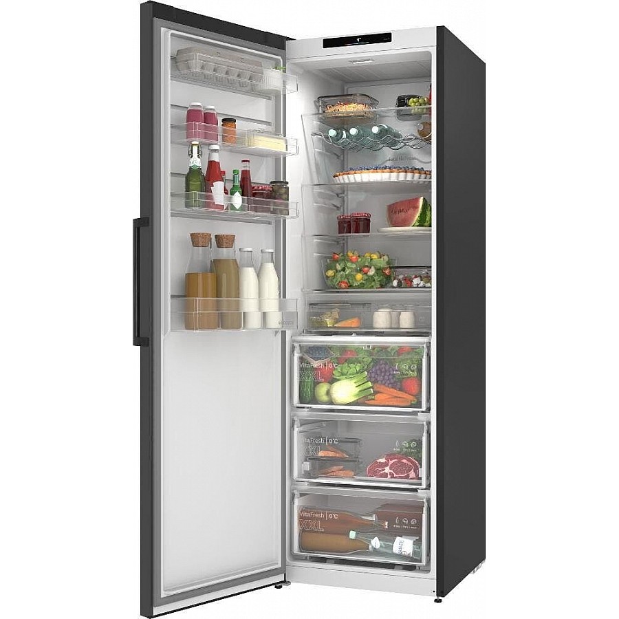 Het PerfectFit-systeem zorgt ervoor dat alle lades en plateaus volledig uitgeschoven kunnen worden wanneer de deur 90 graden open staat, waardoor u eenvoudig bij de achterste items komt. Dit praktische voordeel wordt versterkt door de glanzende witte achterwand, die niet alleen een strakke en hygiënische uitstraling geeft, maar ook van duurzaam materiaal is gemaakt dat eenvoudig schoon te houden is, zodat uw koelkastinterieur altijd fris en georganiseerd oogt.