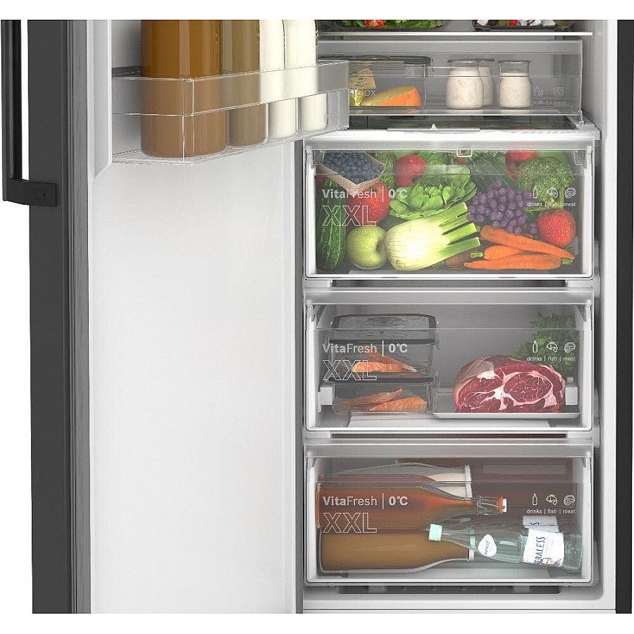 Deze Bosch KSN36VCCG vrijstaande koelkast combineert innovatieve technologie met praktisch design voor ultiem gebruiksgemak. Met de revolutionaire VitaFresh XXL 0°C-lade blijft uw verse voedsel tot wel 14 dagen lang op perfecte wijze bewaard. De Total No Frost-technologie zorgt voor een ijsvrije en droge koelkast, zodat u nooit meer last heeft van waterdruppels of ijsaanslag. Dankzij de uitzonderlijk stille werking met geluidsklasse B geniet u van een rustige keukenomgeving, terwijl het flexibele interieur met verstelbare deurvakken zich moeiteloos aanpast aan al uw boodschappen, van hoge flessen tot grote pannen.