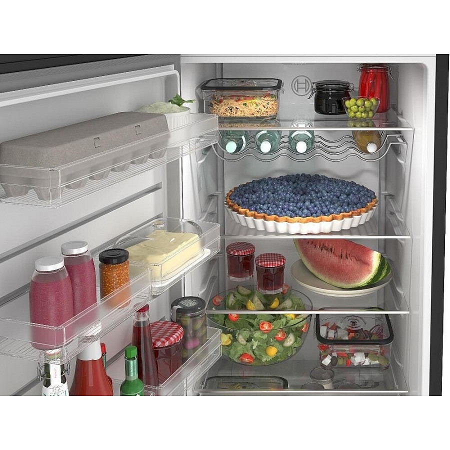 De Total No Frost-functie circuleert koude, droge lucht gelijkmatig door de hele koelkastruimte, waardoor condensvocht effectief wordt geëlimineerd. Dit betekent voor u geen gedoe meer met het ontdooien van de koelkast of het afvegen van natte planken. Gecombineerd met het flexibele interieur, waarvan de deurvakken en uitschuifbare plateaus volledig aanpasbaar zijn, organiseert u moeiteloos alle boodschappen, van grote melkpakken tot kleine potjes, precies zoals het u uitkomt.