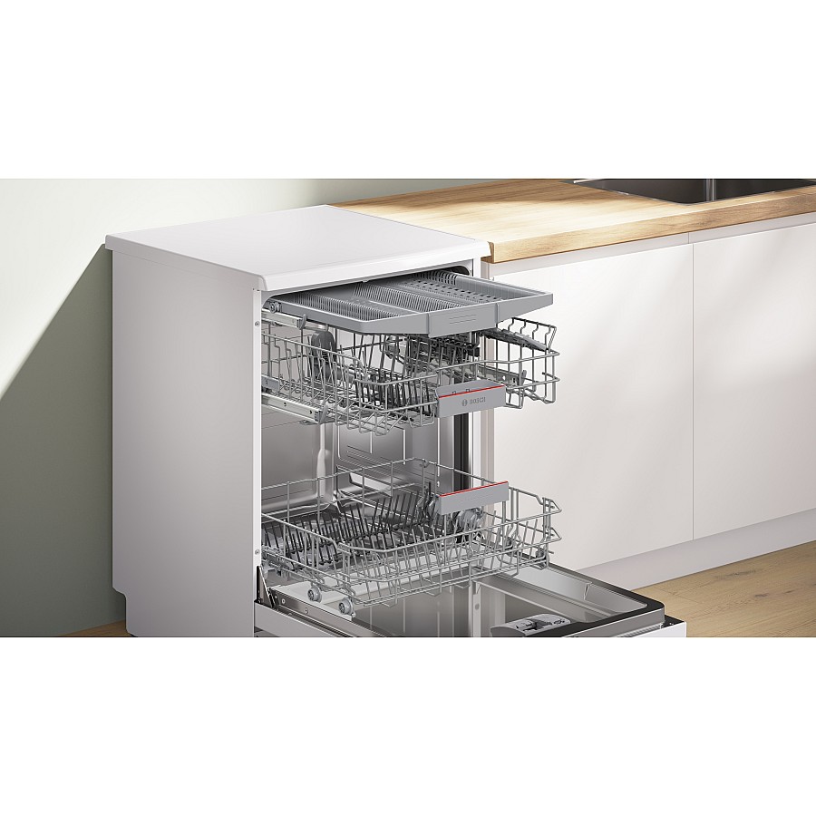 Deze Bosch vaatwasser biedt maximale flexibiliteit bij het inruimen door de VarioFlex Pro servieskorven, de VarioLade voor bestek en het RackMatic-systeem. De bovenste korf is met het handige RackMatic-systeem in drie standen tot 5 cm in hoogte verstelbaar, zelfs als hij volgeladen is. De vouwbare tanden en verplaatsbare elementen in beide korven, gemarkeerd met rode indicatoren, laten u de ruimte perfect aanpassen aan potten, pannen, borden en glazen voor een optimale belading.