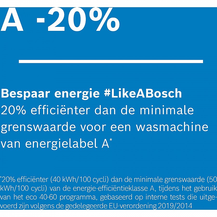 Met een energie-efficiëntieclassificatie van A-20% verbruikt deze wasmachine aanzienlijk minder stroom dan de standaard A-klasse normen. Het ActiveWater Plus systeem, gekoppeld aan de automatische beladingsdetectie, past het waterverbruik dynamisch aan de grootte van de lading aan, terwijl de AquaSensor de spoelkwaliteit bewaakt voor een grondige reiniging met een optimale inzet van hulpbronnen en lagere kosten voor u.