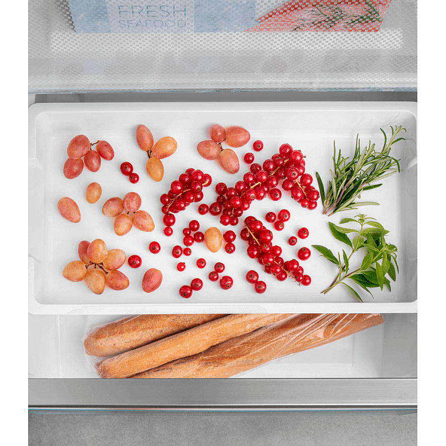 De gevoelige tiptoetsen reageren direct op een lichte aanraking voor een intuïtieve en moderne bediening van alle functies. Het flexibele VarioSpace interieur, met onder andere de ruime SpaceBox, kan eenvoudig worden aangepast om hoog of onregelmatig gevormd voedsel zoals een ijstaart op te bergen, terwijl het speciale invriesplateau ideaal is voor het snel bevriezen van individuele porties fruit of kruiden zonder dat deze aan elkaar plakken.
