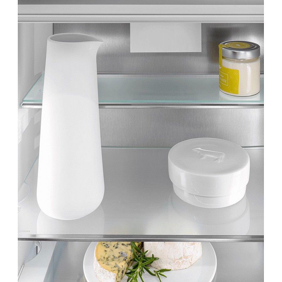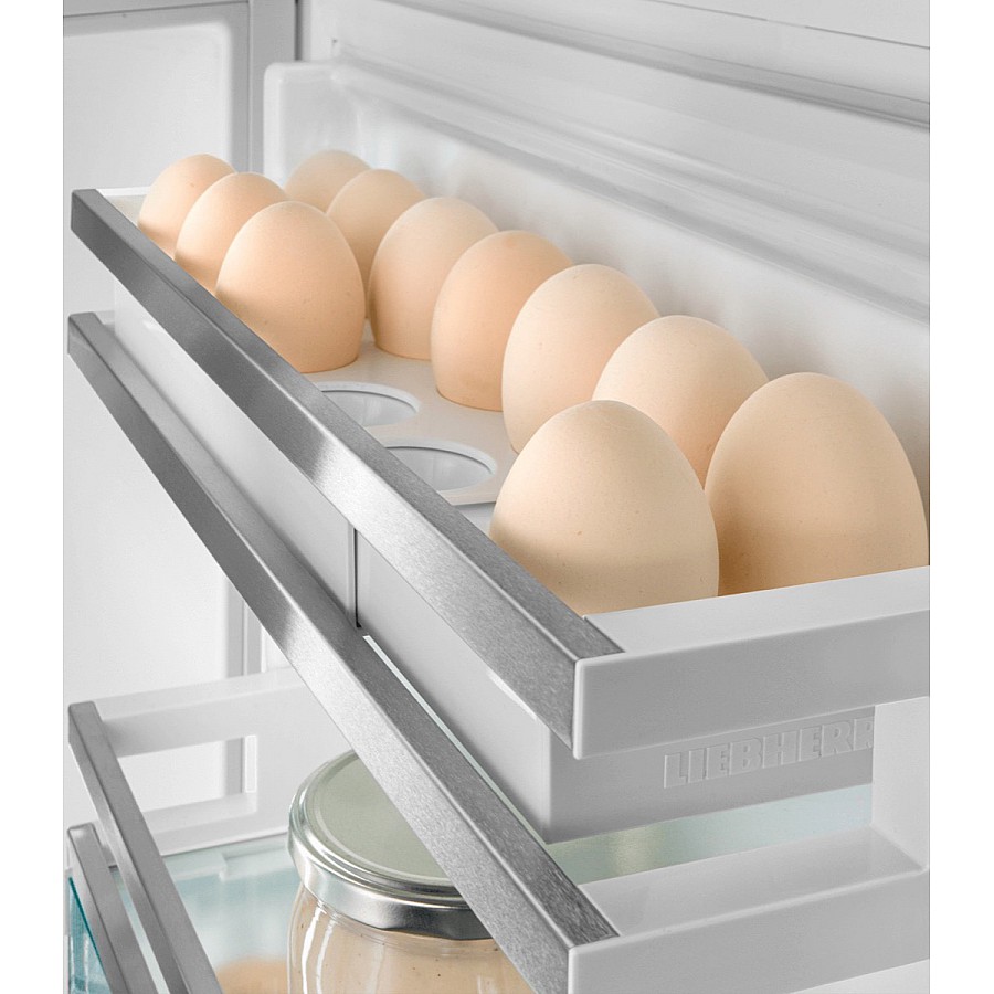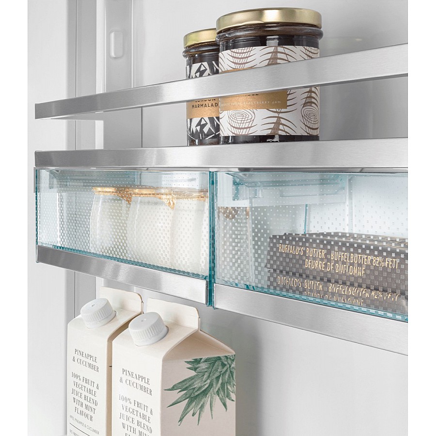 Daarnaast heeft deze koelkast SuperCool voor het snel afkoelen van nieuw toegevoegde etenswaren. De temperatuur wordt gedurende 12 uur tijdelijk verlaagd naar +2°C, zodat de koelkast niet opwarmt en nieuwe levensmiddelen extra snel op de temperatuur worden gebracht. De Liebherr koelkast heeft energielabel D en een deur-op-deur scharniersysteem.