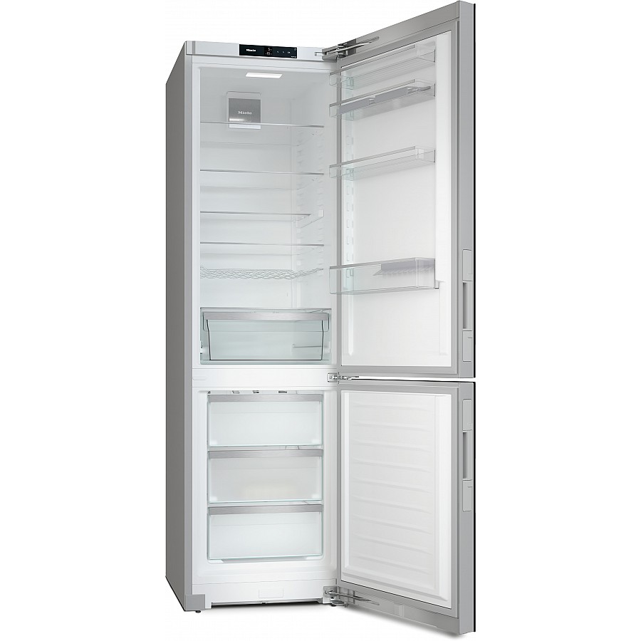 Deze fraaie Miele KFN 4795 DD koel-vriescombinatie heeft een netto inhoud van 373 liter. Daarvan neemt het koelgedeelte 270 liter in en het vriesgedeelte 103 liter. De koel-vriescombinatie is 201,5 cm hoog en heeft een breedte van 60 cm, met een diepte van 67,5 cm. Deze koel-vriescombinatie heeft energielabel D. Het apparaat is voorzien van no frost zodat je het vriesgedeelte nooit hoeft te ontdooien.