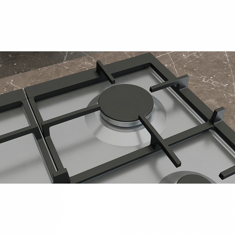Het roestvrijstalen oppervlak en de mat zwarte gietijzeren pannendragers zijn vervaardigd uit volledig metaal voor een uitzonderlijke duurzaamheid en een tijdloze esthetiek. Dit robuuste ontwerp garandeert een lange levensduur en bestendigheid tegen slijtage, terwijl het een stijlvolle aanvulling vormt op uw keukeninrichting.