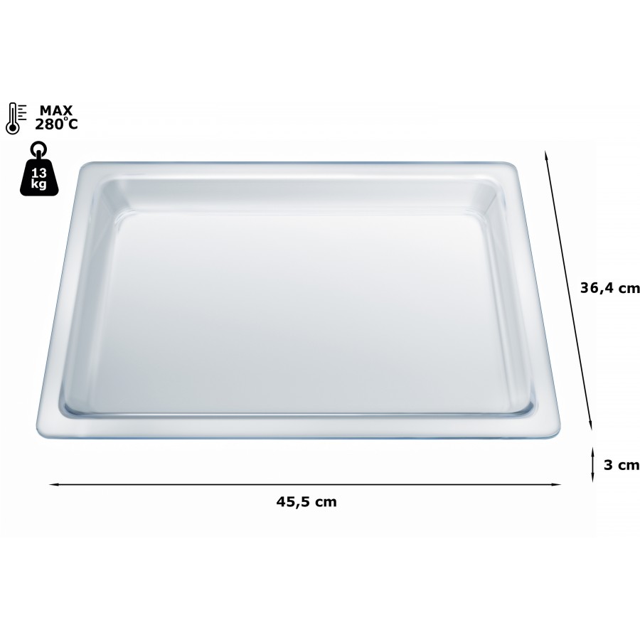 Deze glazen schaal is compatibel met 45 cm en 60 cm bakovens, past in een ovenwagen en kan gebruikt worden in de magnetron en voor stoomkoken. Deze technische veelzijdigheid biedt u als gebruiker de vrijheid om vrijwel elke bereidingswijze te kiezen, van het opwarmen van restjes tot het stomen van groenten of het bakken van een cake, allemaal in hetzelfde robuuste accessoire.
