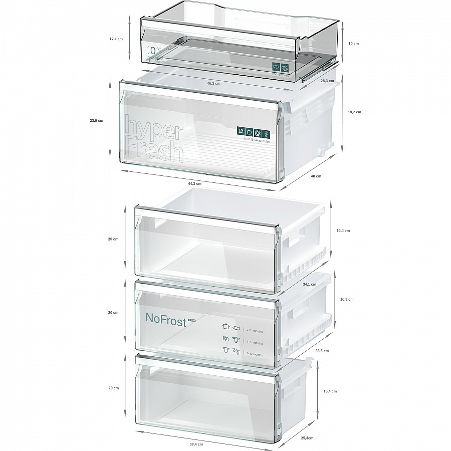 Het hyperFresh vershoudsysteem omvat twee gespecialiseerde laden: één met regelbare luchtvochtigheid voor groente en fruit en een tweede die een temperatuur rond het vriespunt handhaaft voor vis en vlees. Deze gecombineerde aanpak creëert de ideale bewaaromgeving voor verschillende soorten verse producten, waardoor hun natuurlijke smaak, vitamines en versheid aanzienlijk langer behouden blijven in uw huishouden.
