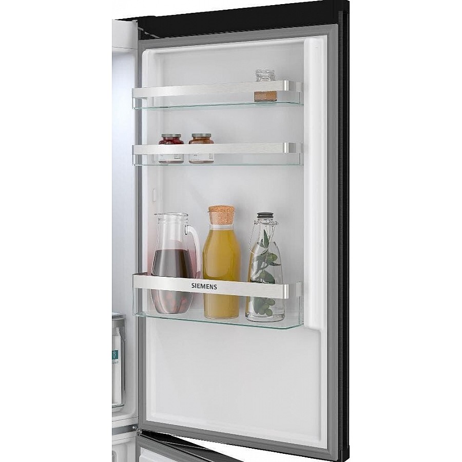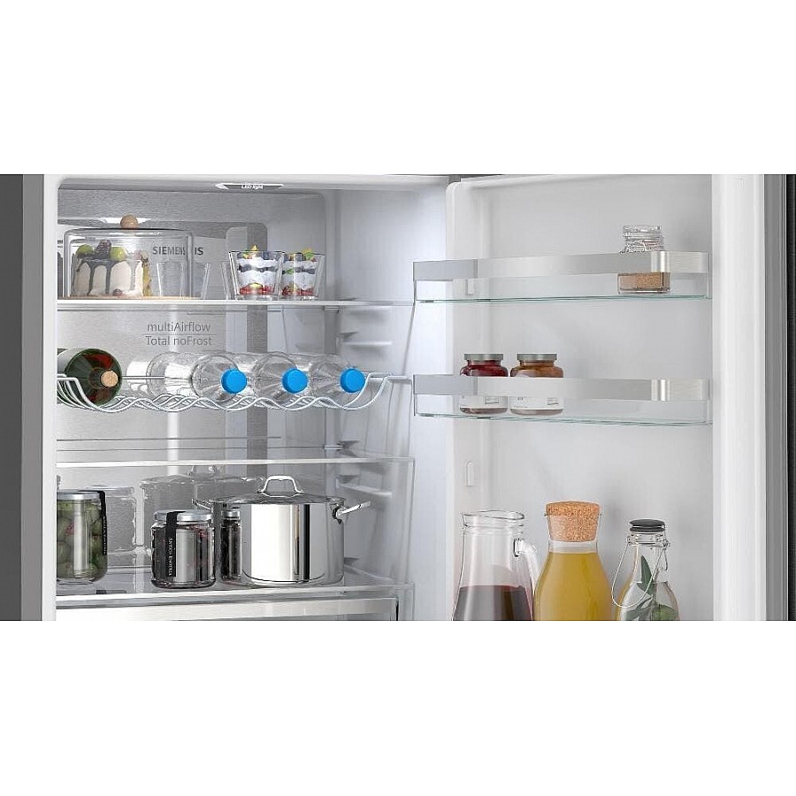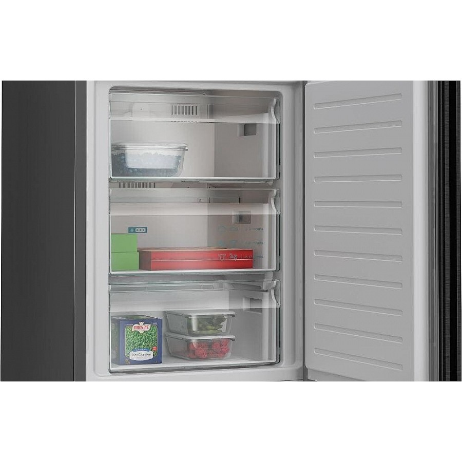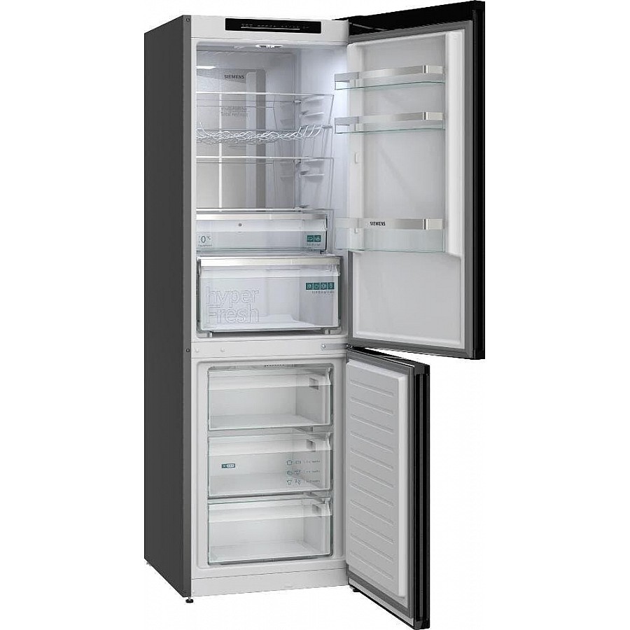 Deze Siemens KG36NVXBG vrijstaande koel-vriescombinatie combineert een energiezuinig B-label, het volledig ijsvrije Total NoFrost systeem en een geruisloze 33 dB werking met een ruim totaalvolume van 321 liter en het praktische hyperFresh vershoudsysteem voor een optimale bewaring van al uw verse levensmiddelen.