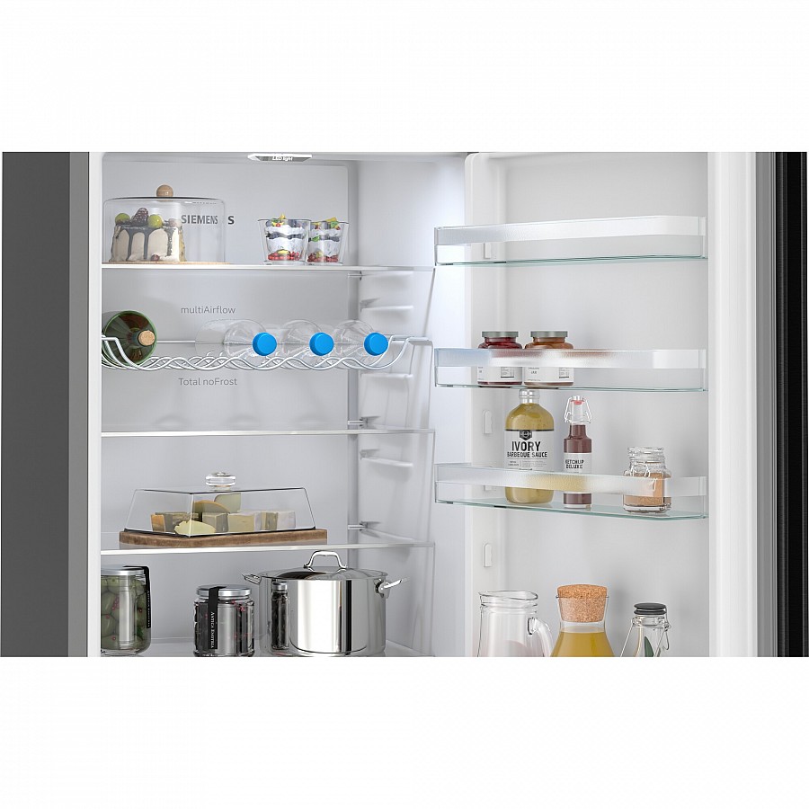 Het multiAirflow-systeem circuleert koele lucht gelijkmatig door de gehele koelruimte via de witte hoogglans achterwand, waardoor er geen warme zones ontstaan en alle producten uniform worden gekoeld. Gecombineerd met vijf veiligheidsglasplateaus, waarvan drie in hoogte verstelbaar, en vier praktische deurvakken, creëert dit een uiterst flexibele en efficiënte indeling die perfect is voor het organiseren van al uw boodschappen, van grote flessen tot kleine verpakkingen.