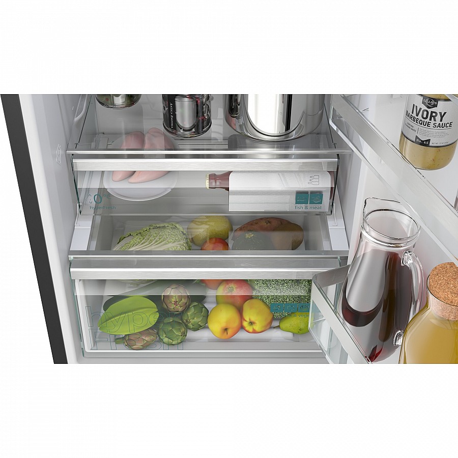 De speciale hyperFresh-lades bieden een gecontroleerde omgeving met een instelbare luchtvochtigheid voor groente en fruit, en een koudezone van 0°C voor vlees en vis. Deze geavanceerde temperatuur- en vochtigheidsregeling vertraagt het bederf van je etenswaren aanzienlijk, zodat je langer kunt genieten van de verse smaak en voedingswaarden van je producten.
