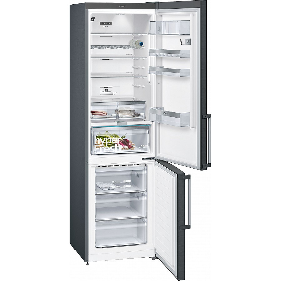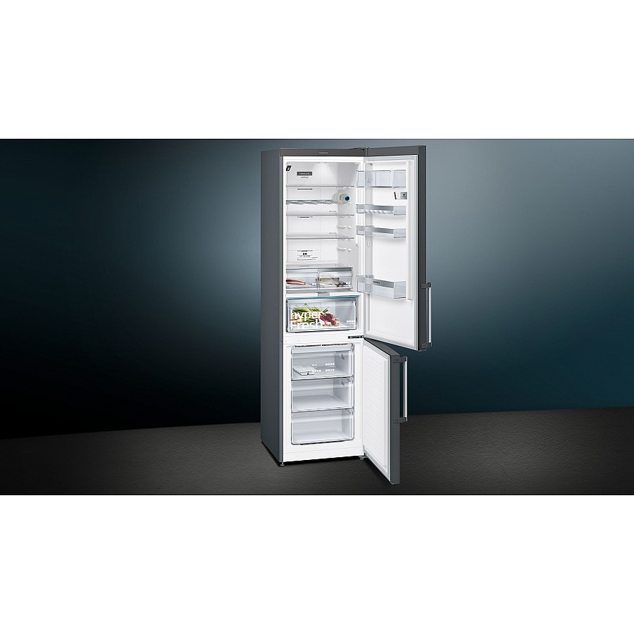 Deze Siemens KG39NHXEP vrijstaande BlackSteel koel-vriescombinatie heeft een totale netto inhoud van 368 liter. De koelkast heeft een zuinig energielabel E en een geluidsniveau van 39 dB. Energiezuinige LED verlichting verlicht de binnenzijde helder en gelijkmatig.