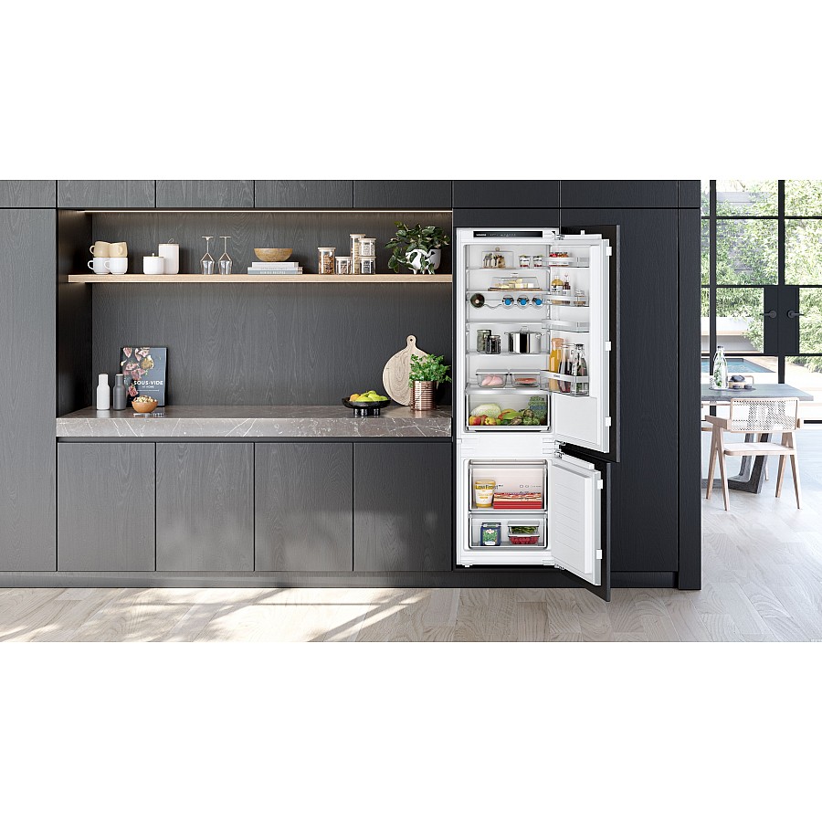 Deze Siemens KI87VVFE1 inbouw koel-vriescombinatie brengt innovatieve koeltechnologie naadloos in uw keuken. Met een ruim totaalvolume van 270 liter en een uitzonderlijk stil geluidsniveau van slechts 35 dB geniet u van perfecte frisheid zonder storend achtergrondgeluid. Het hyperFresh-vershoudsysteem met vochtigheidsregeling zorgt ervoor dat groente en fruit aanzienlijk langer hun vitamines en knapperigheid behouden. Dankzij de energiezuinige E-label prestaties en de krachtige lowFrost-technologie in het vriesgedeelte bespaart u moeiteloos op energie en ontdooiwerk.