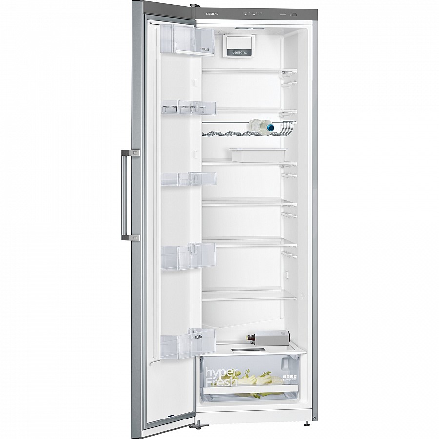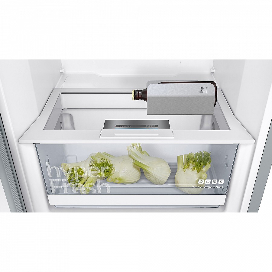 Deze Siemens KS36VGIDP vrijstaande koelkast combineert geavanceerde koeltechnologie met praktisch design in een stijlvol geborsteld stalen kastwerk dat bestand is tegen vingerafdrukken. Dankzij de hyperFresh-lade blijven je groenten en fruit aanzienlijk langer vers door een geoptimaliseerd klimaat met de perfecte luchtvochtigheid, terwijl de bottleCooler je flessen in recordtijd koelt tot net boven het vriespunt. De energiezuinige ledverlichting, vooraan gemonteerd voor onbelemmerd zicht, zorgt voor perfecte zichtbaarheid van alle inhoud, en met de Home Connect app bedien je eenvoudig functies zoals superKoelen op afstand. De intelligente compressor past zich automatisch aan voor constante prestaties en optimaal energieverbruik, waardoor deze koelkast niet alleen uiterst functioneel is maar ook bijdraagt aan een lager stroomverbruik in je huishouden.