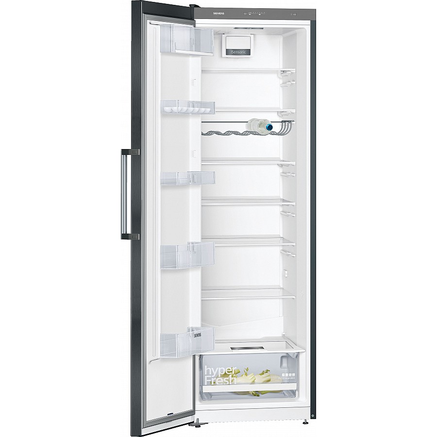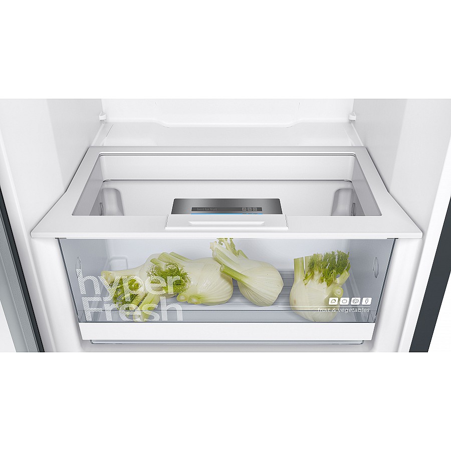 Deze Siemens KS36VVXDP vrijstaande koelkast uitgevoerd in BlackSteel heeft een totale netto inhoud van 346 liter. De koelkast heeft een zuinig D energielabel en een geluidsniveau van 39 dB. Verder is het koelgedeelte verlicht met helder, energiezuinige LED verlichting en hyperFresh lade om groente en fruit langer vers te houden.
