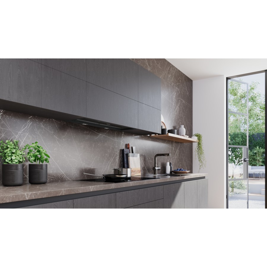 Het speciale installatiesysteem is ontworpen voor een snelle en moeiteloze inbouw door slechts één persoon. Dankzij slimme bevestigingshulpmiddelen en minder onderdelen integreert de kap naadloos in uw 90 cm bovenkast. Het strakke zwartglazen front met aanraakbediening zorgt voor een minimalistisch design dat perfect aansluit bij moderne keukens.