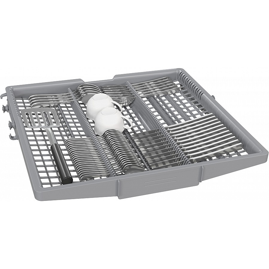 De verstelbare bovenkorf (Rackmatic) biedt extra ruimte voor hoge glazen of pannen, terwijl de besteklade zorgt voor geordend opbergen. Dit systeem past zich aan uw behoeften aan, waardoor u meer vaat kwijt kunt zonder compromissen.