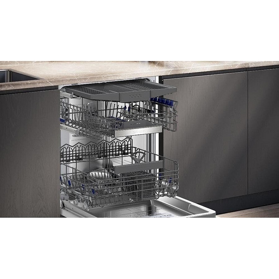 Siemens SN65YX05CE volledig geïntegreerde vaatwasser combineert hoogwaardige reiniging met intelligente innovatie voor een onovertroffen gebruiksgemak. Dankzij het krachtige Zeolith-droogsysteem droogt zelfs kunststof vaatwerk perfect en stralend. De slimme Home Connect technologie stelt je in staat om de machine overal te bedienen, programma's te versnellen en energie te besparen via smartStart. De flexComfort inrichting met flexibele korven en de speciale glassZone zorgen voor ultieme bescherming en een moeiteloze belading van al je servies, van borden tot delicate glazen.