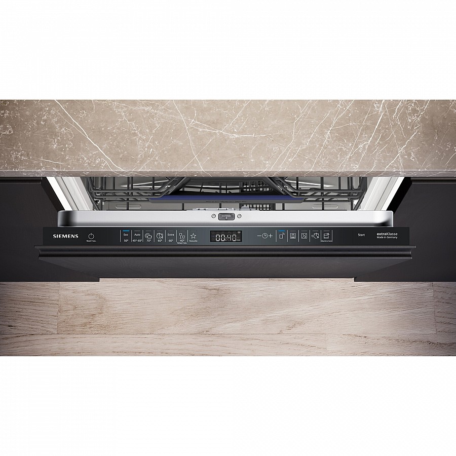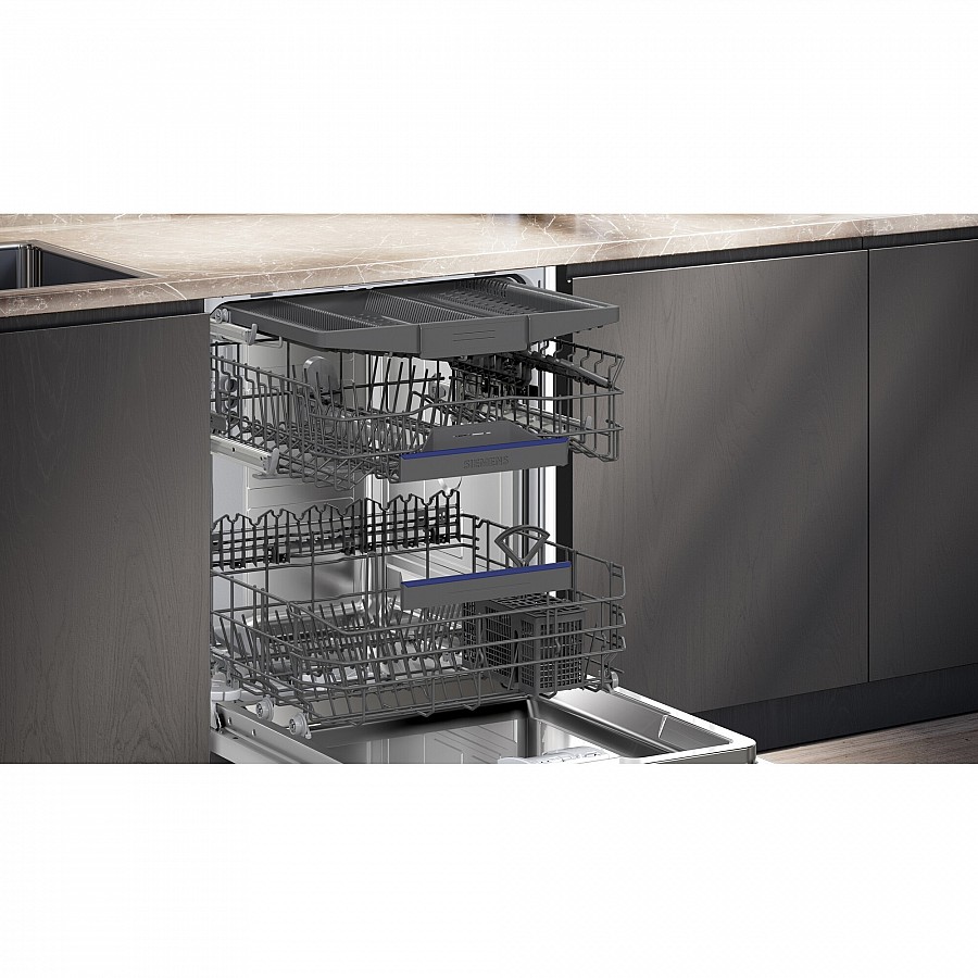 Deze Siemens SX75EX04CE volledig geïntegreerde vaatwasser combineert een uitzonderlijke energie-efficiëntie van klasse A met de revolutionaire varioSpeed Plus technologie voor extreem snelle wasbeurten, biedt maximale flexibiliteit dankzij de varioLade en flexibele korven, en garandeert een geruisloze werking door de geavanceerde iQdrive motor voor een superieure afwaservaring in elk modern huishouden.