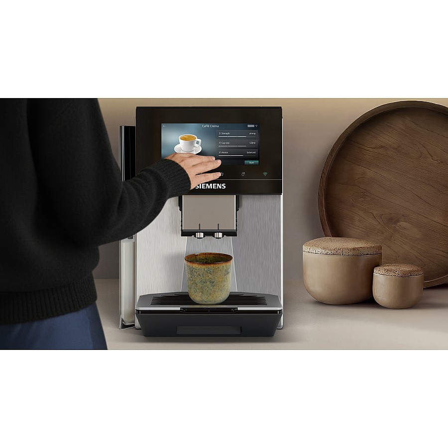 Deze Siemens TQ927FZ3 volautomatische koffiemachine brengt baristakwaliteit direct in jouw keuken. Met het innovatieve iAroma-systeem garandeert hij een perfecte smaak uit elke boon, ondersteund door een slijtvast keramisch maalwerk. Het grote 6,8 inch iSelect touch display geeft je intuïtieve controle over meer dan 40 warme en koude dranken, waaronder verfrissende Cold Brew. Dankzij het dualBean System met twee aparte bonenreservoirs en maalsystemen wissel je moeiteloos tussen twee favoriete koffiesoorten, terwijl automatische reinigingsprogramma's voor maximale hygiëne en gemak zorgen.