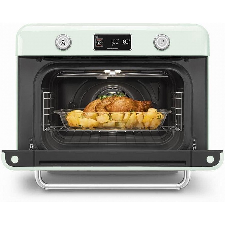 Met de Galileo Multicooking technologie beheerst u tien kookfuncties, van stomen en bakken tot airfryen en grillen, allemaal in de ('Smeg COF01PGEU vrijstaande stoomoven'). Dit wordt ondersteund door het intuïtieve My SMEG Assistant-scherm en een chefmenu met 33 automatische programma's. Deze combinatie van geavanceerde luchtsturing en slimme software betekent dat u met een simpele aanraking professionele resultaten bereikt, of u nu een beginner bent of een ervaren thuiskok.